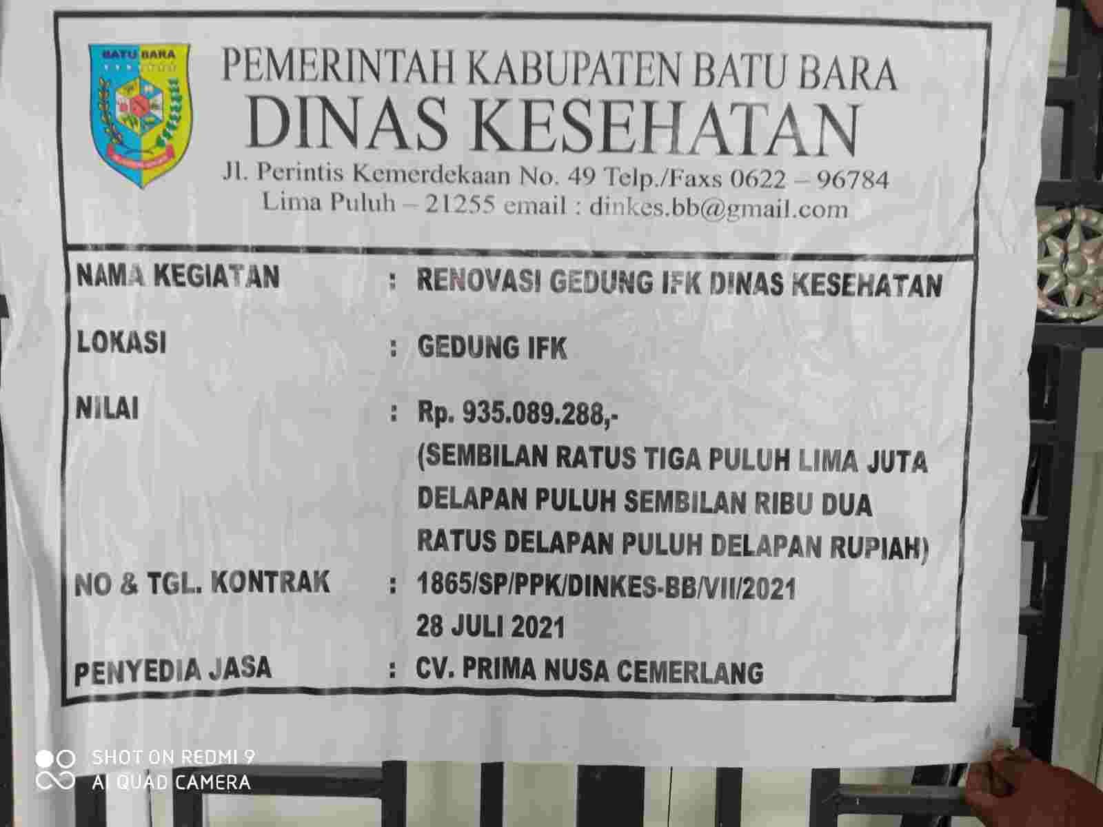 Meski pandemi Covid-19 masih belum berakhir namun Pemerintahan Kabupaten (Pemkab) Batu Bara melalui Anggaran Pendapatan Belanja Daerah (APBD) Tahun 2021, telah mengucurkan biaya Rp. 935.089.288 untuk renovasi Gedung Farmasi Dinkes Batu Bara.