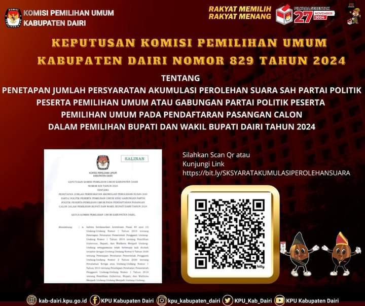 Keputusan ini menggantikan Keputusan KPU Kabupaten Dairi Nomor 813 Tahun 2024 yang sebelumnya mengatur syarat minimal perolehan kursi dan suara sah. Keputusan baru ini mulai berlaku sejak 24 Agustus 2024 dan telah ditandatangani oleh Ketua KPU Kabupaten Dairi, Ariyanto Tinendung.