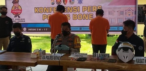 Dua pelaku diamankan masing-masing, AE dan DS. Selain itu diamankan pula barang bukti berupa, satu ball sabu ukuran besar, satu ukuran sedang dan satu ukuran kecil serta satu motor dinas merek Suzuki Smash “Ungkap Kapolres Bone, AKBP Ardiansyah, Rabu (06/10).