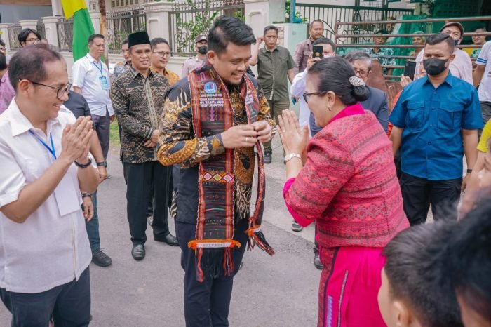 Medan, kedannews.com – Tarian tortor disertai pengulosan menyambut kedatangan Wali Kota Medan Bobby Nasution saat melaksanakan Safari Natal di GKPI Jemaat Khusus Glugur Darat Jalan Gunung Seulawah, Kelurahan Glugur Darat, Kecamatan Medan Timur, Minggu (27/11). Dalam Safari Natal itu, menantu Presiden Joko Widodo ini berharap peran gereja tidak hanya memberikan manfaat terhadap jemaat saja, tapi juga bagi warga sekitarnya.