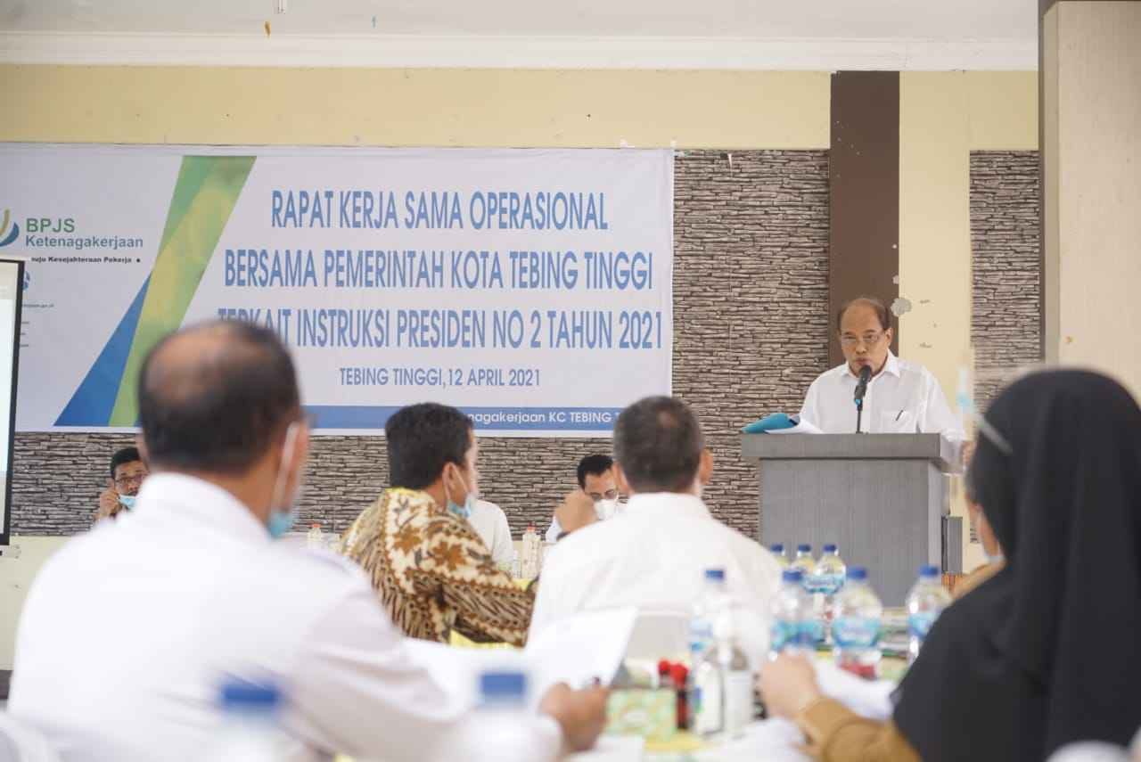 Deputi Direktur BPJS Ketenagakerjaan Wilayah Sumbagut Panji Wibisana dalam sambutannya menjelaskan, kegiatan ini adalah untuk benar-benar bagaimana negara hadir melindungi seluruh pekerja yang ada di Kota Tebingtinggi. Dan tentunya juga dapat kami laporkan bahwa ada Intruksi Presiden No.2 Tahun 2021 yang telah diberlakukan sejak tanggal 1 April ini.