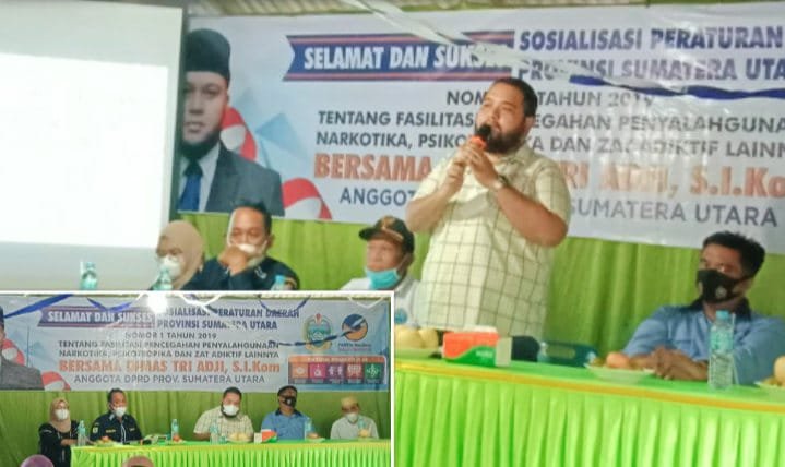 Serdang Bedagai, kedannews.com – Dalam rangka peringatan Hari Anti Narkoba Internasional (HANI) Tahun 2021 Anggota DPRD Sumut Dimas Tri Adji, S.I.Kom dari Fraksi Nasdem laksanakan Sosialisasi tentang penyalahgunaan Narkotika serta mensosialisasikan tentang pelaksanaan Perda No. 1 Tahun 2019 tentang Fasilitas Pencegahan Penyalahgunaan Narkotika, Psikotropika, dan Zat Adiktif bertempat di Kampung Rebab Dusun III tepatnya pada Balai Desa Dolok Merawan Kecamatan Dolok Merawan Sergai, Senin (28/6/2021) Sore.