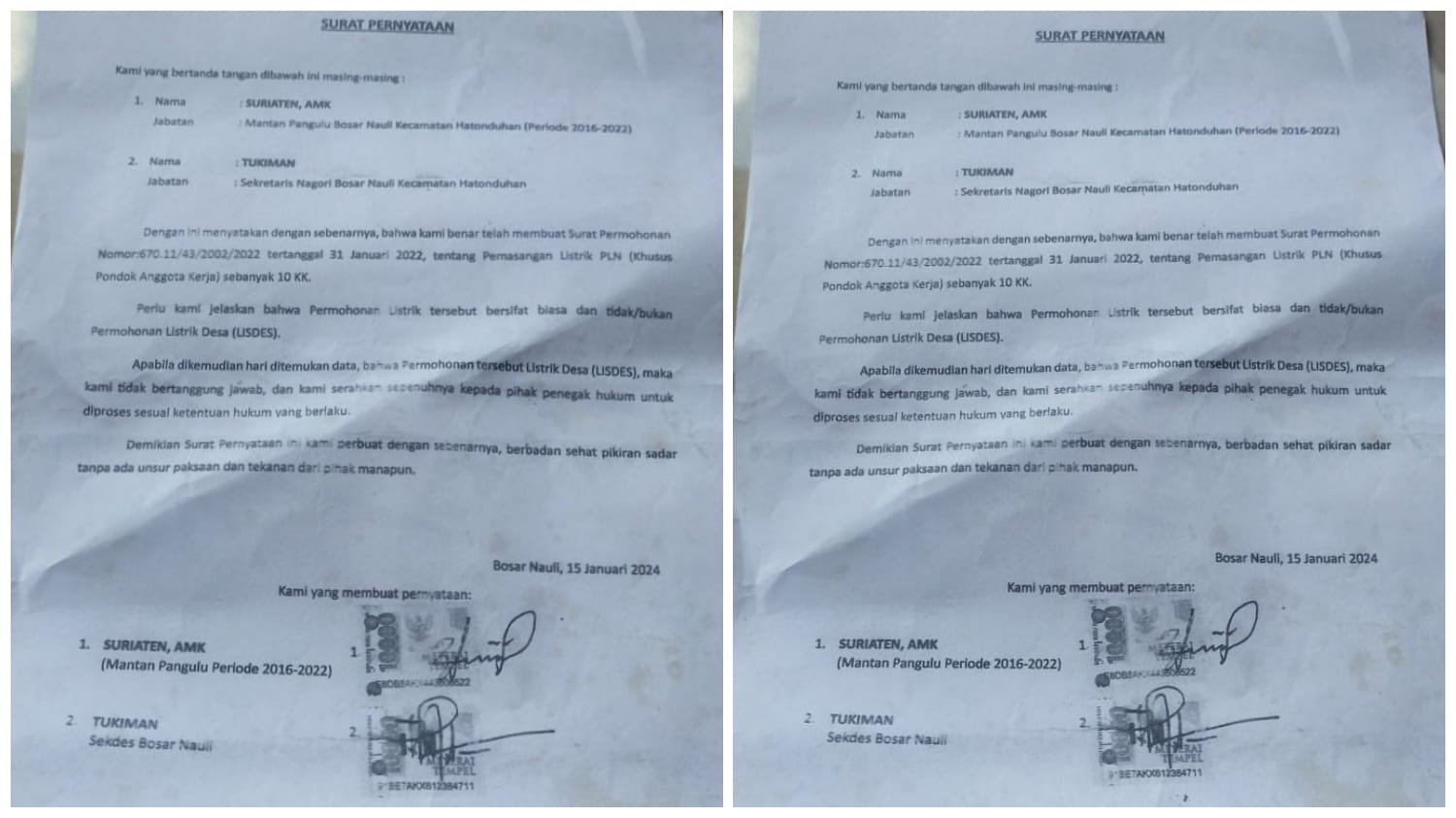 Mantan Pangulu Bosar Nauli periode 2016–2022, Suriaten AMK, bersama Sekretaris Desa saat itu, Tukiman, menegaskan bahwa pihaknya tidak pernah mengajukan proposal Lisdes kepada PT PLN. Pernyataan tersebut tertuang dalam Surat Pernyataan tertanggal 15 Januari 2024.