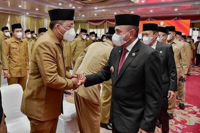 Medan, kedannews.com β Gubernur Sumatera Utara (Sumut) melantik 123 pejabat Administrasi dan Pengawas di lingkungan Pemerintah Provinsi (Pemprov) Sumut, di Aula Tengku Rizal Nurdin, Rumah Dinas Gubernur, Jumat (2/9). Pelantikan ini sebagai bagian dari evaluasi kinerja dan loyalitas dalam rangka sinergitas organisasi.