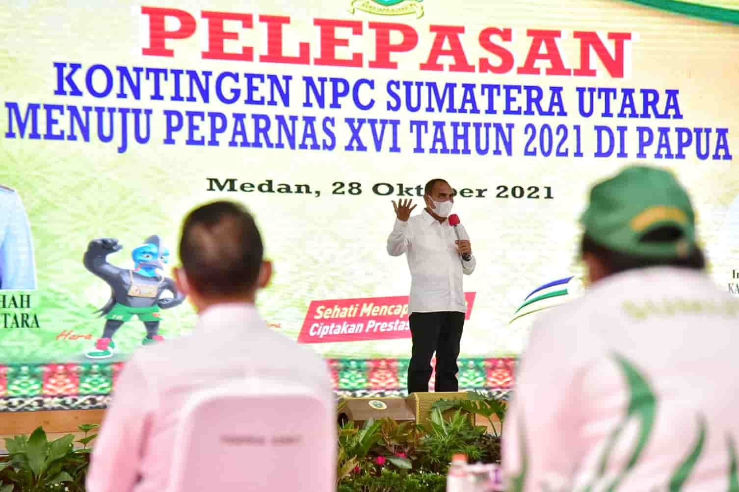 MEDAN, kedannews.com – Gubernur Sumatera Utara (Sumut) Edy Rahmayadi melepas keberangkatan kontingen Sumut untuk mengikuti Pekan Paralimpik Olahraga Nasional (Peparnas) XVI Papua, Kamis (28/10), di Aula Tengku Rizal Nurdin, Rumah Dinas Gubernur Sumut, Jalan Sudirman 41 Medan. Para atlet Paralimpik diharapkan dapat berjuang sekuat tenaga dan mengharumkan nama Sumut di kancah nasional.