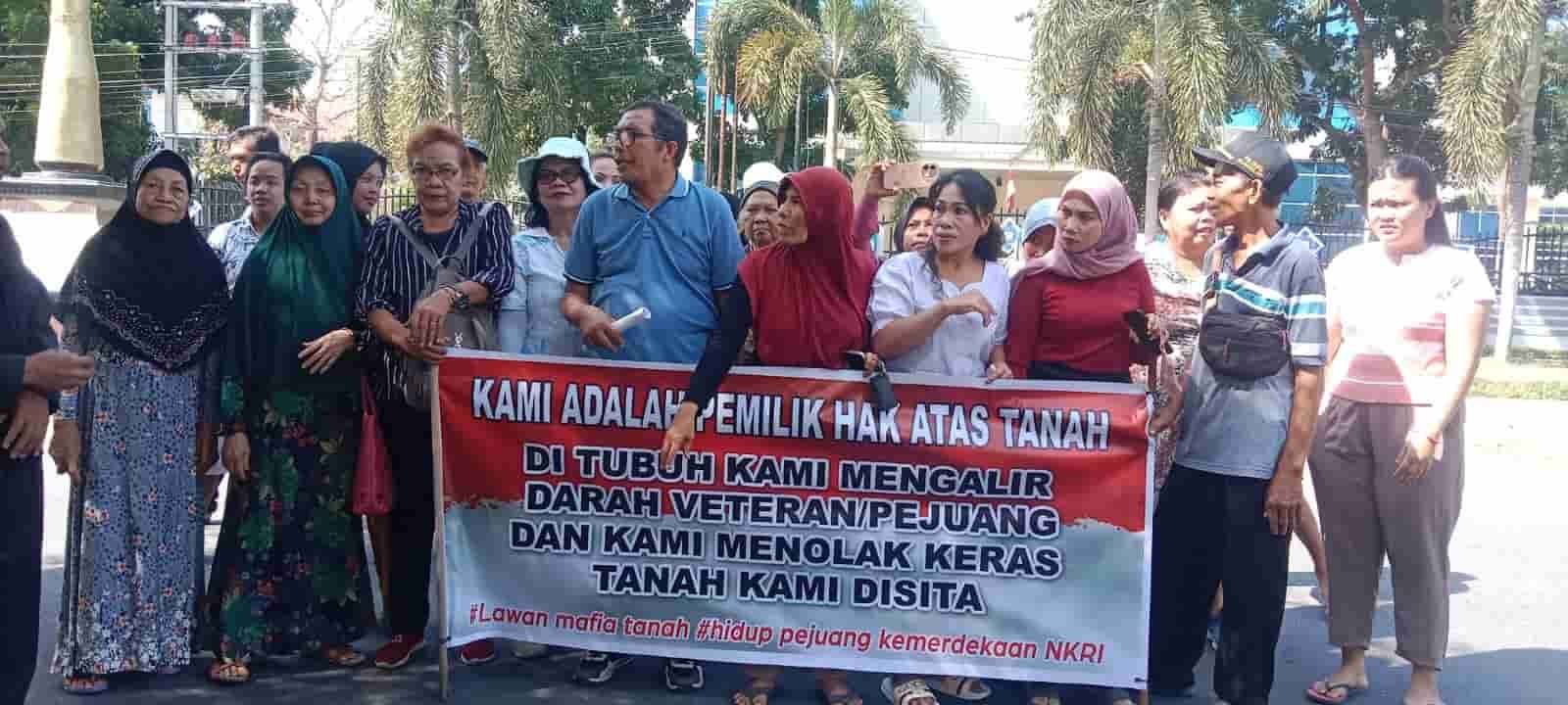 Para warga pun melakukan protes dengan membentang spanduk yang bertuliskan ‘Kami adalah pemilik hak atas tanah. Di tubuh kami mengalir darah veteran/pejuang dan kami menolak keras tanah kami disita’.
