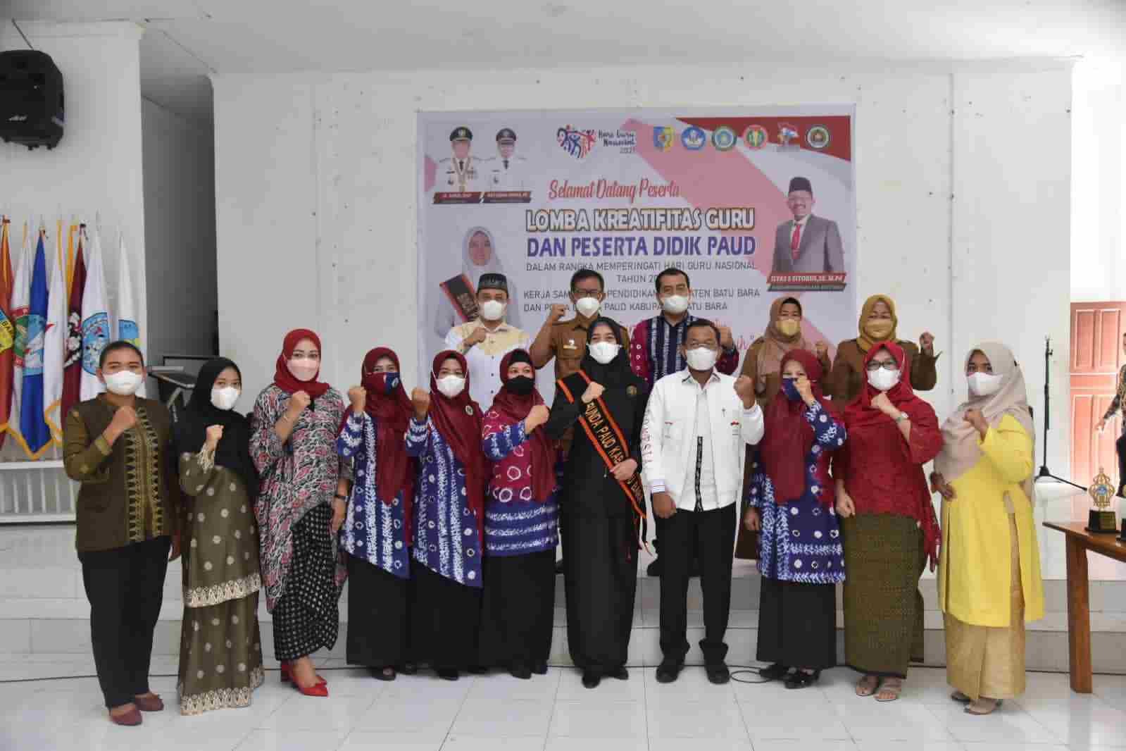 Batu Bara, kedannews.com – Gebyar Hari Guru Nasional (HGN) Dinas Pendidikan Kabupaten Batu Bara bekerja sama Ketua Bunda PAUD selenggarakan lomba Kreativitas Guru dan Peserta Didik, Pendidikan Anak Usia Dini (PAUD). Di Aula Gedung Dinas Pendidikan. Kecamatan Lima Puluh Pesisir. Selasa (23/11/2021).