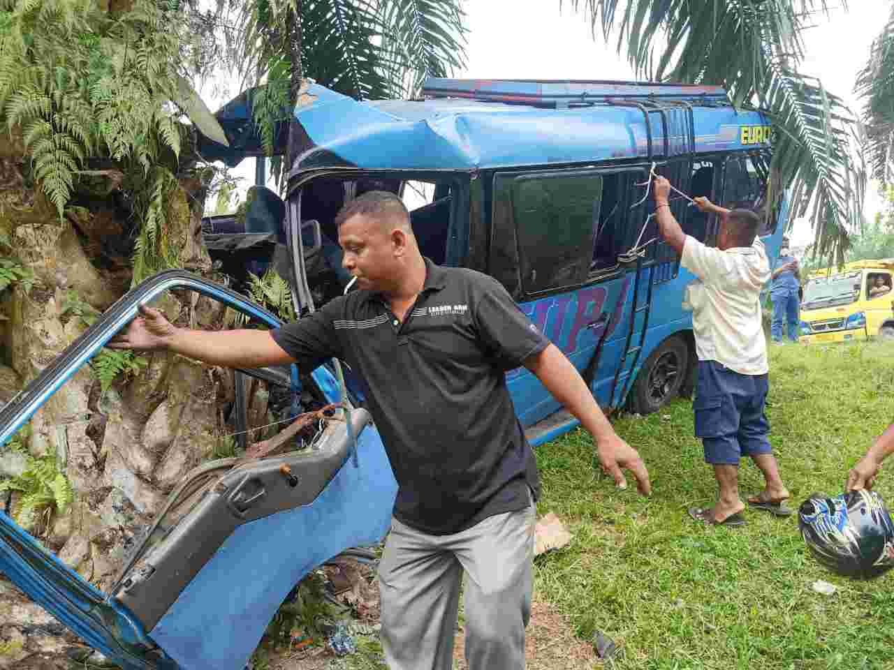 Batu Bara, kedannews.com – Hindarkan tabrakan laga kambing, Bus KUPJ tabrak pembatas jembatan dan akhirnya nyungsep menabrak pohon kelapa sawit, di Jalinsum KM, 126 – 127 Perkebunan Limau Manis, Kecamatan Lima Puluh, Kabupaten Batu Bara. Rabu (23/06/2021)
