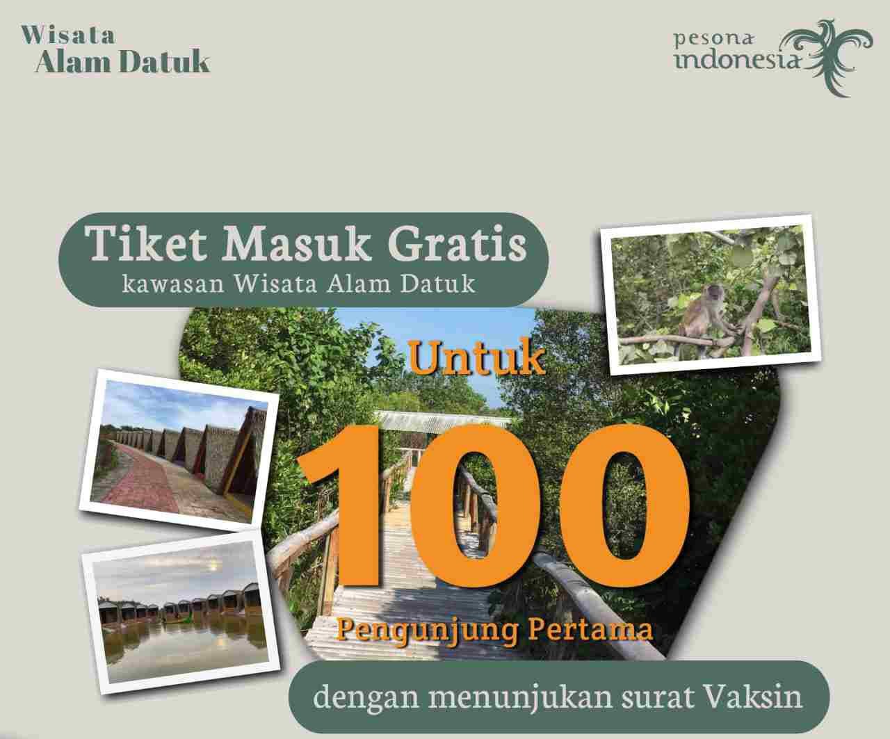 Batu Bara, kedannews.com – Pengelola objek Wisata Alam Datuk (WAD) Kuala Indah, Kecamatan Sei Suka, Batu Bara, gratiskan 100 orang pengunjung pertama selama dua hari, promo berlaku terhitung Selasa dan Rabu tanggal 18 – 19 Mei 2021. Promo di Hari Idul Fitri tersebut berlaku bagi pengunjung yang dapat menunjukkan surat keterangan sudah di Vaksin Covid – 19.