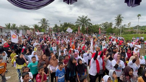 Asahan, kedannews.com – Kader Gerindra gelar jalan sehat dan senam Gemoy bersama ribuan masyarakat di Aek Ledong Kab. Asahan, Minggu (17/12). Yel-yel ‘Prabowo-Gibran menang satu putaran’ menggema di Asahan.