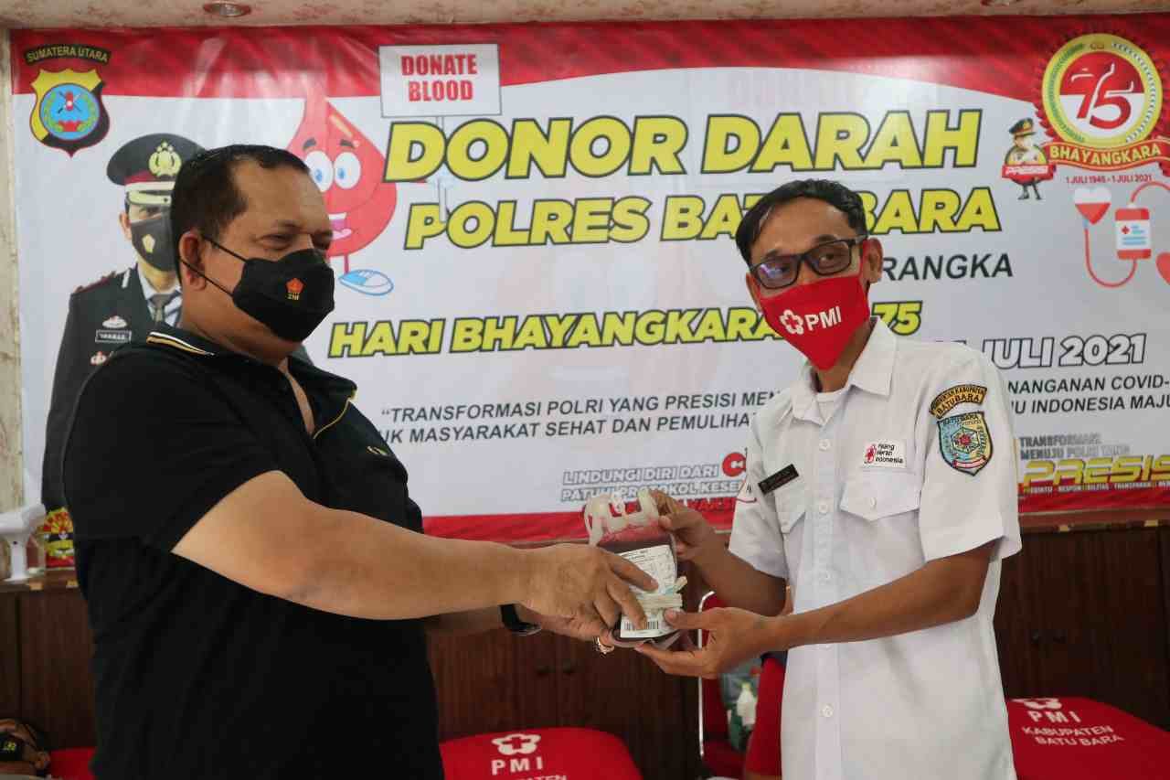 Dilakukan pendonoran bagi setiap satu orang Personil Polres Batubara rata rata 350 CC yang nantinya akan diserahkan kepada PMI Kabupaten Batu Bara guna kepentingan kemanusiaan bagi masyarakat yang membutuhkan.