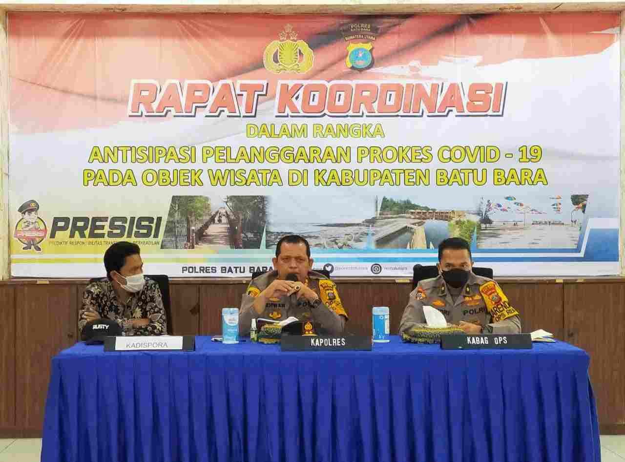 Hal tersebut diungkapkan Kapolres Batu Bara pada Rapat Koordinasi dalam rangka antisipasi pelanggaran Prokes Covid-19 pada Objek Wisata di Kabupaten Batu Bara yang digelar di Aula Bhayangkari Polres Batu Bara, Kamis (29/4/2021).