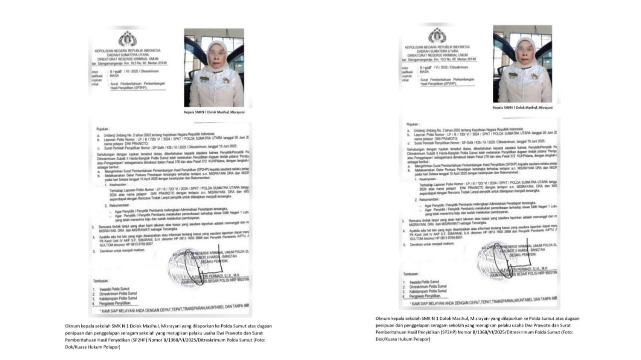 “Dalam proses penyidikan, penyidik Ditreskrimum Polda Sumut telah meningkatkan status dua terlapor, Misrayani dan Misirawati, menjadi tersangka. Hal ini tertuang dalam SP2HP Nomor B/1368/VI/2025/Ditreskrimum Polda Sumut tanggal 30 Juni 2025,” jelas Jones.