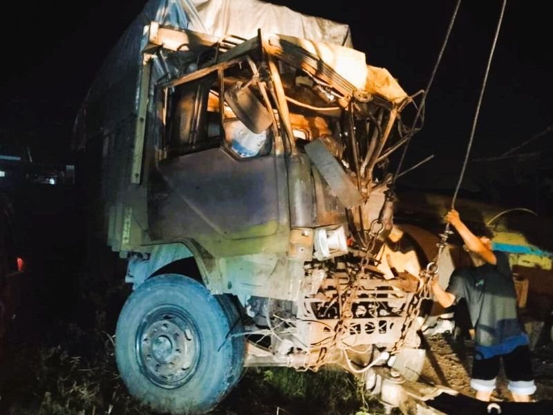 Truk yang dikemudikan Sadikun (73) tersebut menabrak bagian belakang truk Colt Diesel BK 8139 WS yang dikemudikan Danar Estate (37) serta sepeda motor korban yang berada searah di depannya.