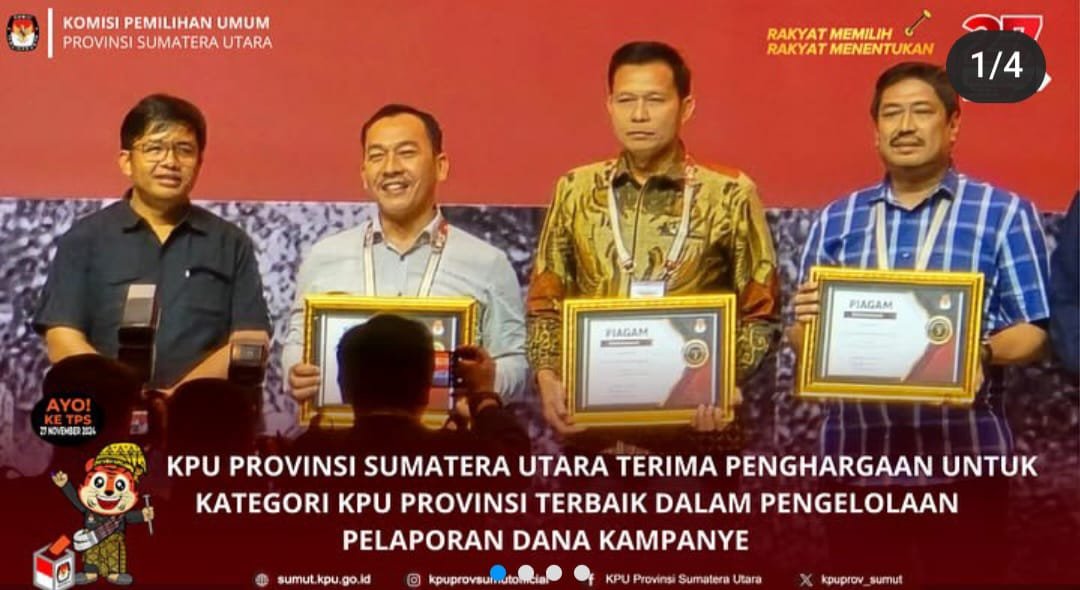 Medan, kedannews.com – Komisi Pemilihan Umum (KPU) Provinsi Sumatera Utara berhasil meraih penghargaan sebagai KPU Provinsi terbaik dalam pengelolaan pelaporan dana kampanye. Penghargaan bergengsi ini diterima dalam Rapat Koordinasi Nasional (Rakornas) Persiapan Penetapan Pasangan Calon Terpilih Gubernur, Wakil Gubernur, Bupati, Wakil Bupati, Walikota, dan Wakil Walikota pada Pemilihan Serentak 2024. Acara berlangsung pada 14 hingga 17 Desember 2024 di Hotel The Meru Sanur, Bali.