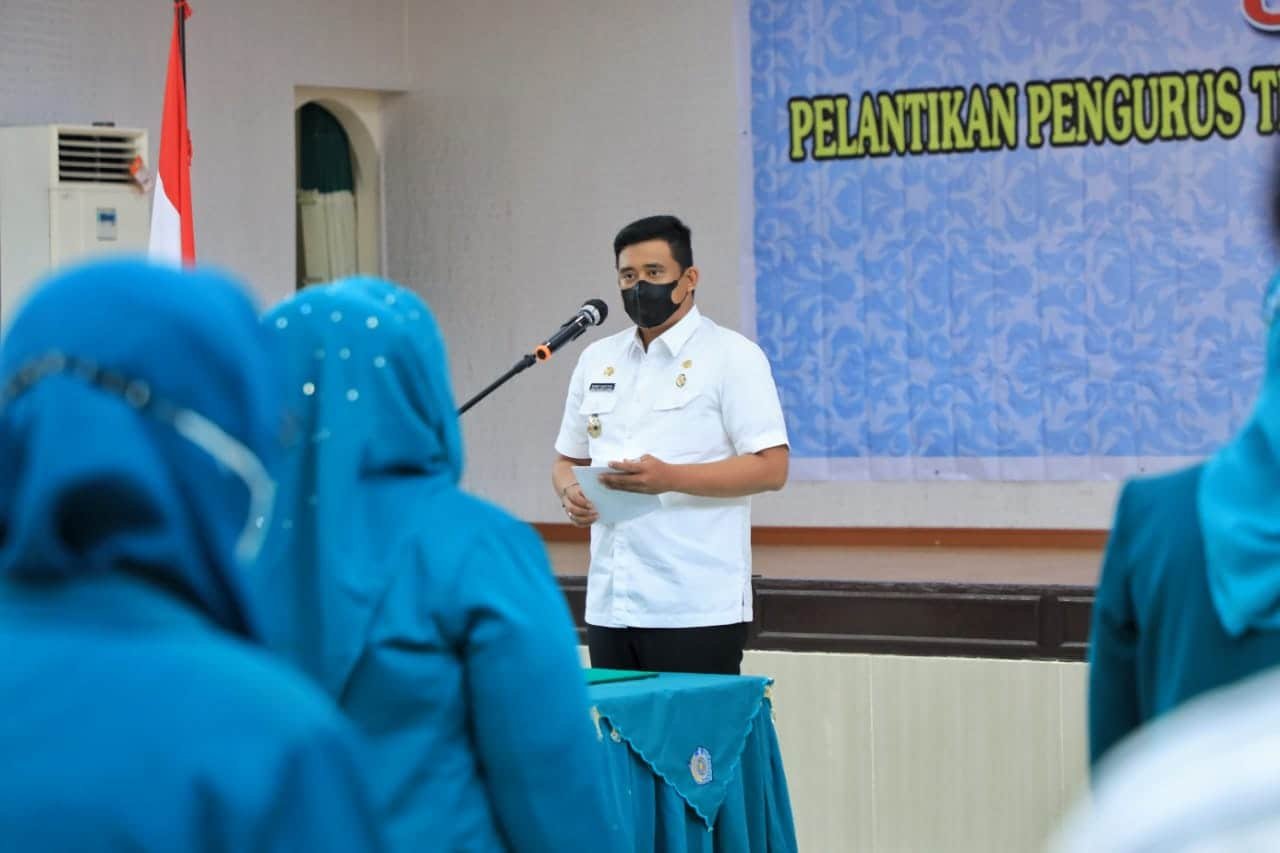 Medan, kedannews,com – Wali Kota Medan Bobby Nasution melantik pengurus Tim Penggerak Pemberdayaan Kesejahteraan Keluarga (TP PKK) Β Kota Medan periode 2021-2024 di Aula Dharmawanita Kota Medan, Jalan Rotan Petisah, Rabu (10/11). Diharapkan TP PKK Kota Medan dapat menjalankan Program Pokok PKK untuk Pembangunan Kota Medan. Selain itu dapat mengajak kader maupun ibu- ibu di setiap lingkungan untuk dapat memperbaiki sektor ekonomi ditengah Pandemi Covid-19 dan bersiang dengan daerah lainnya.
