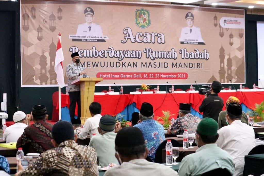 Hal ini disampaikan Wali Kota Medan Bobby Nasution saat membuka kegiatan Pemberdayaan Rumah Ibadah untuk Mewujudkan Masjid Mandiri di Hotel Inna Dharma Deli, Kamis (18/11).
