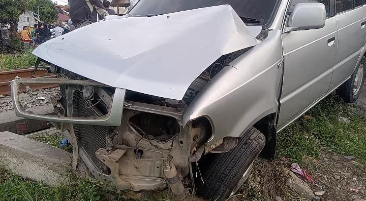 Bagian depan mobil remuk hingga rangka terbuka, sementara benturan keras membuat kendaraan terseret sekitar lima meter ke pinggir rel. Meski kondisi mobil tampak rusak berat, pengemudi hanya mengalami luka memar di kepala bagian kanan, sementara istri dan anaknya mengalami luka ringan.