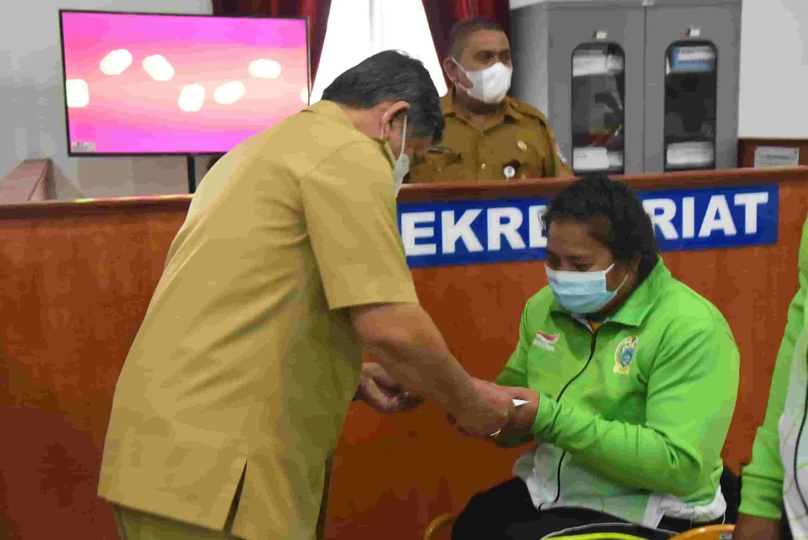 “Dan pada hari ini juga, akan diberikan bonus terhadap Atlet Deli Serdang atas nama Welman David Pasaribu Peraih Medali Perak, Cabang Olahraga Atletik Marathon 42,192 KM Putra dan Riska Andini Peraih Medali Perunggu, Cabang Olahraga Pencak Silat Kelas E Putri 65-70 Kg pada ajang PON XX Papua Tahun 2021”. Ungkap Kadis Porabudpar.