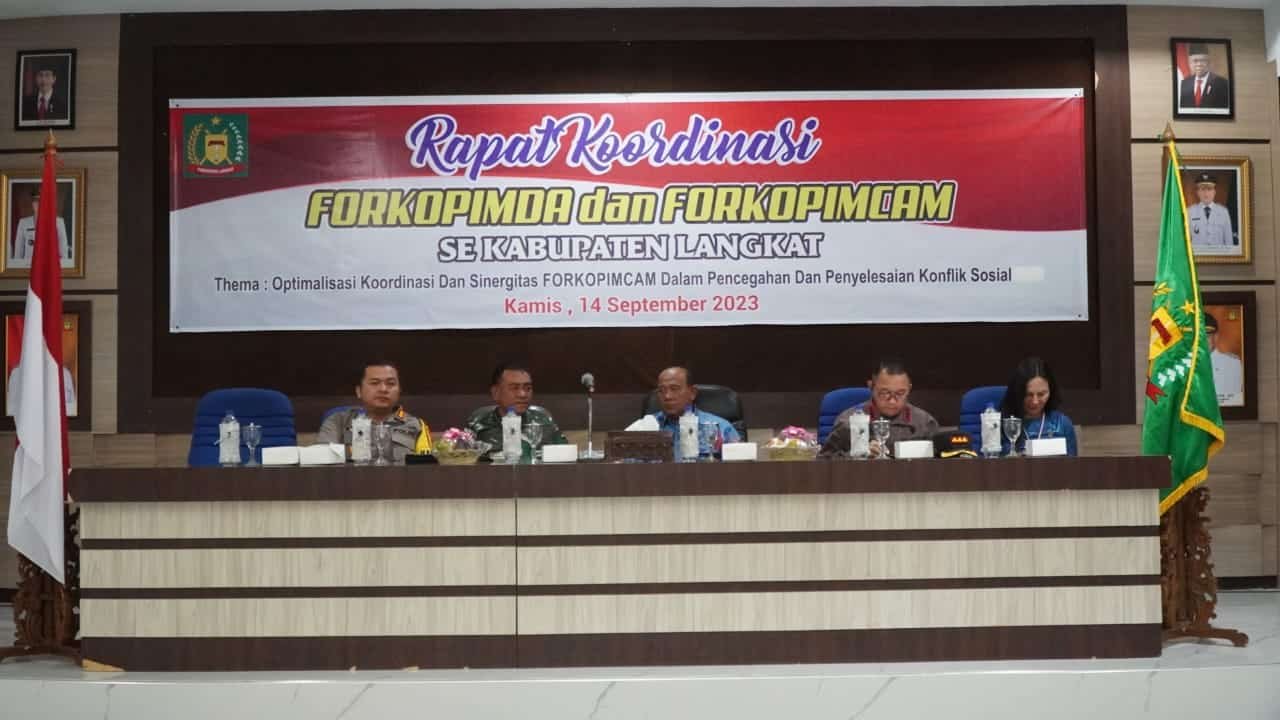 Plt Bupati Langkat H. Syah Afandin, SH menyampaikan bahwa pelaksanaan rapat koordinasi perkopimda dan perkopincam pada hari ini merupakan tindak lanjut dari peraturan Pemerintah Nomor 12 Tahun 2022 tentang forum koordinasi pimpinan di daerah dan peraturan Bupati Langkat Nomor 10 Tahun 2023 tentang forum koordinasi pimpinan daerah dan forum koordinasi pimpinan kecamatan.