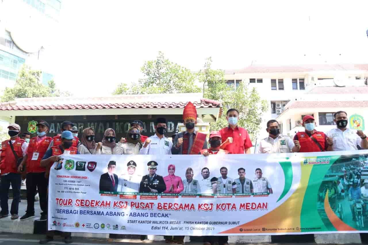 Dengan mengenakan pakaian adat Batak Toba, Sekda Kota Medan dan Ketua DPRD Medan Hasyim SE didampingi Ketua Umum KSJ, Saharudin dan Plt Kasat Pol PP Rakhmat Harahap memberikan secara simbolis 100 paket sembako kepada pengemudi becak bermotor. Adapun paket sembako tersebut berupa beras, minyak makan dan mie instan.