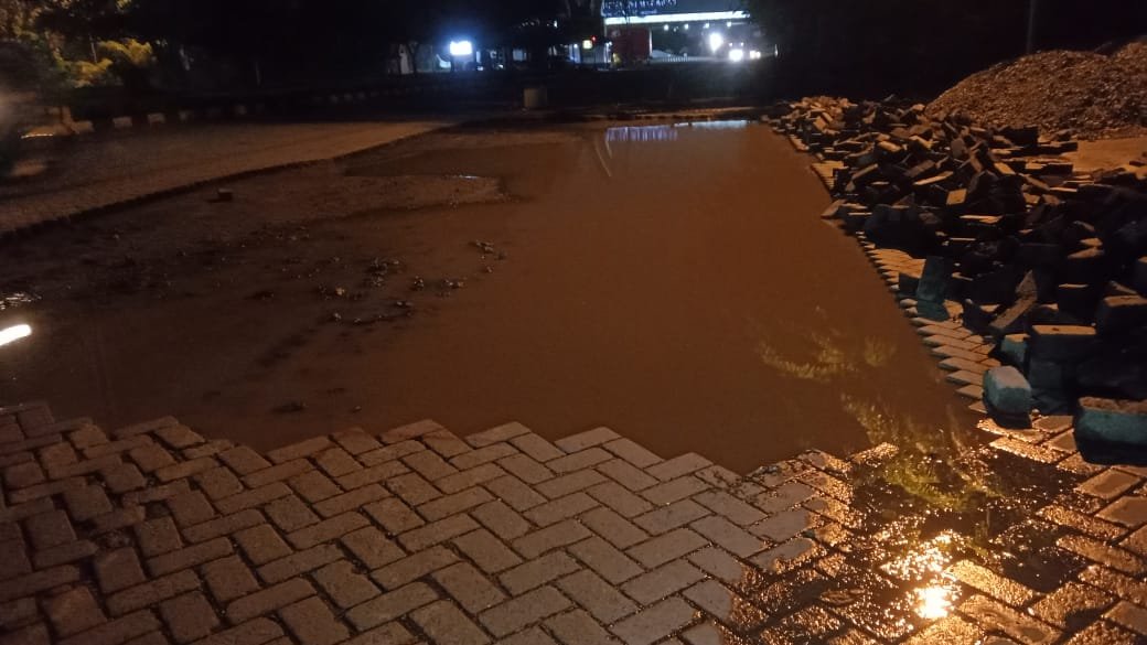 Berdasarkan pantauan di lapangan, terlihat sebagian area jalan telah digali dan tergenang air, membentuk lubang besar. Lubang tersebut berada tepat di dekat tumpukan material paving block, kerikil, dan pasir yang berserakan hingga ke bahu jalan.
