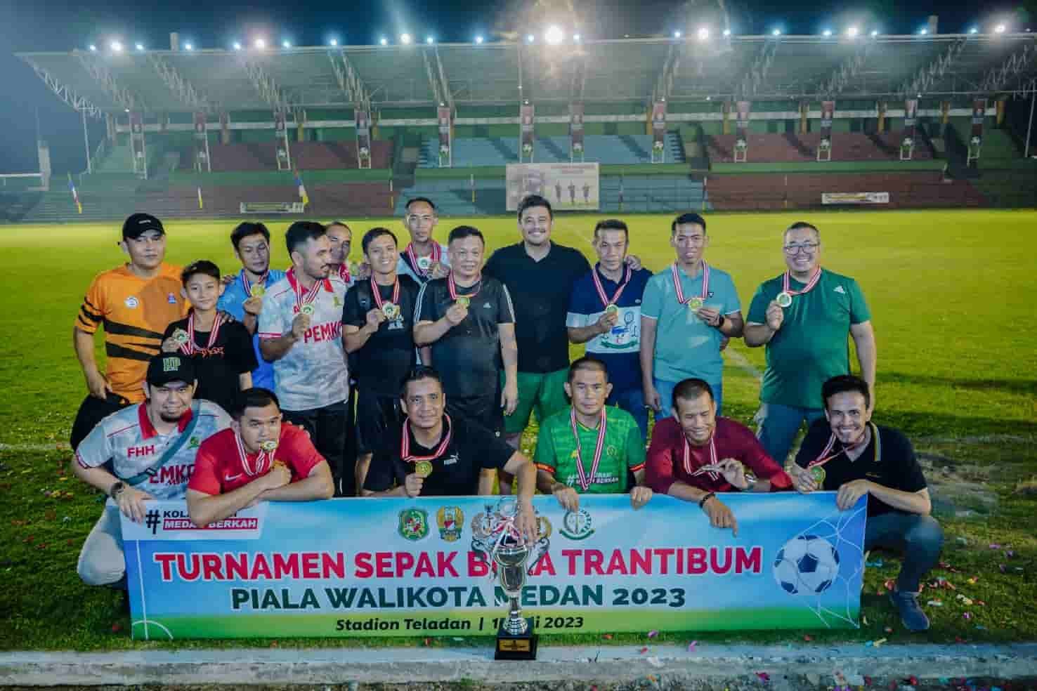 Medan, kedannews.com – Skor 2-0 mewarnai kemenangan PS Pemko Medan atas PS Kejari (Kejari Medan & Kejari Belawan) dalam laga bertajuk Turnamen Sepak Bola Trantibum yang berlangsung di Stadion Teladan Medan, Minggu (16/7/2023) malam. Wali Kota Medan Bobby Nasution berhasil mencetak satu gol lewat tendangan penalti.
