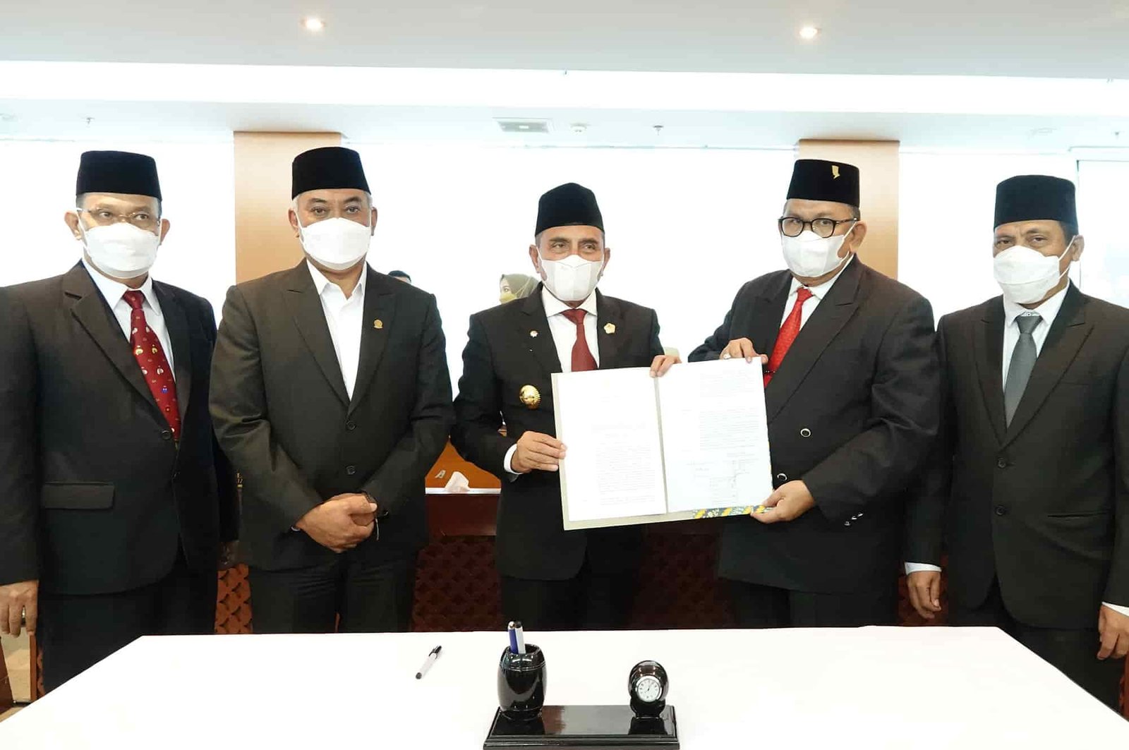 βTerima kasih kepada seluruh anggota DPRD Sumut, atas dukungan dan kerja kerasnya. Hal ini merupakan bentuk kepedulian tehadap pembangunan di Sumut ,β ungkap Gubernur Edy Rahmayadi dalam sambutannya.
