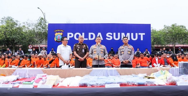 “Operasi ini mengarah kepada para pelaku bandar dan pengedar narkoba. Alhamdulillah, (penindakaan narkoba) dari kerja sama yang kuat dengan seluruh stakeholder pemberantasan narkoba,” ujar Kapolda Sumut Irjen Pol Agung Setya Imam Effendi saat menggelar konferensi pers tangkapan narkoba di Polda Sumut, Rabu (4/10/2023).