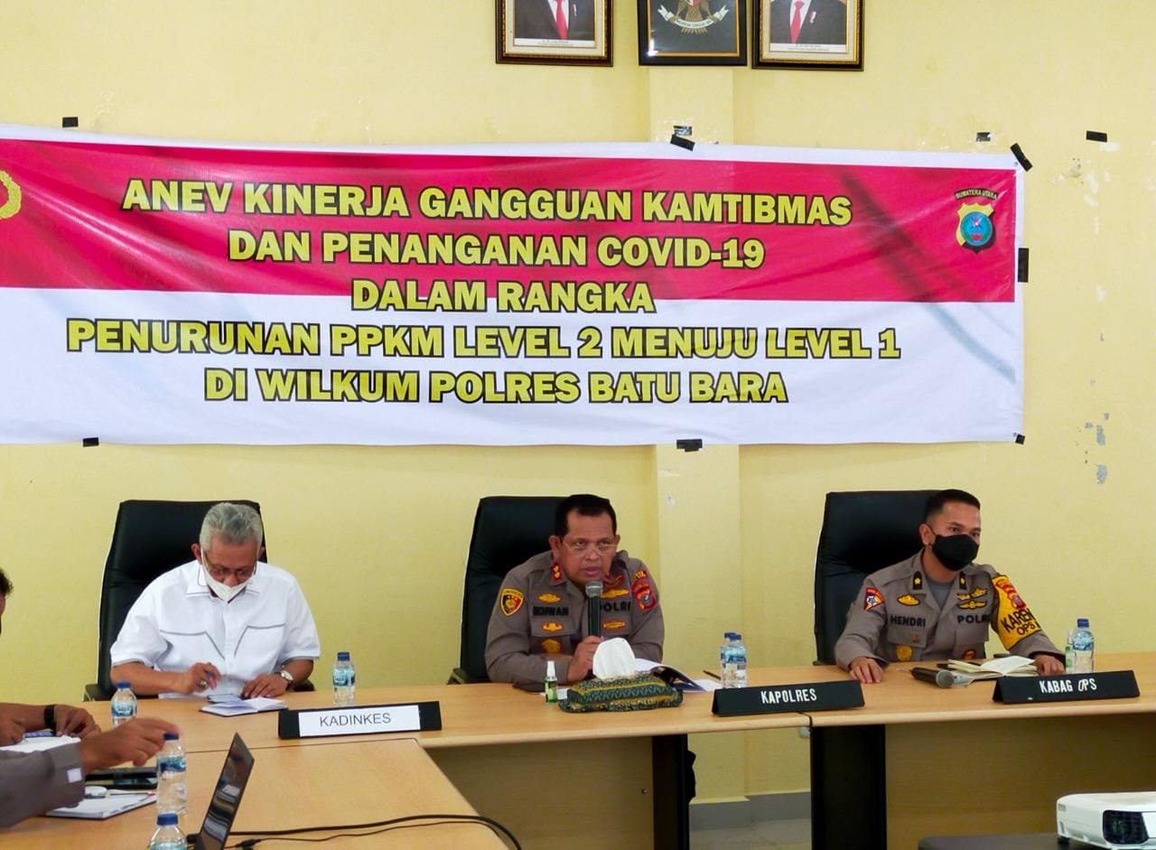 Batu Bara – Kedan News | Kapolres Batu Bara AKBP Ikhwan Lubis SH, MH, melaksanakan Anev bersama Kadinkes drg Wahid Khusairy, Penanganan Covid-19 dalam Rangka Penurunan Pemberlakuan Pembatasan Kegiatan Masyarakat (PPKM) Level 2 Menuju Level 1 di Wilayah Hukum Polres Batu Bara yang di laksanakan di Aula Wira Pradana Polres Batu Bara. Rabu (13/10/2021).