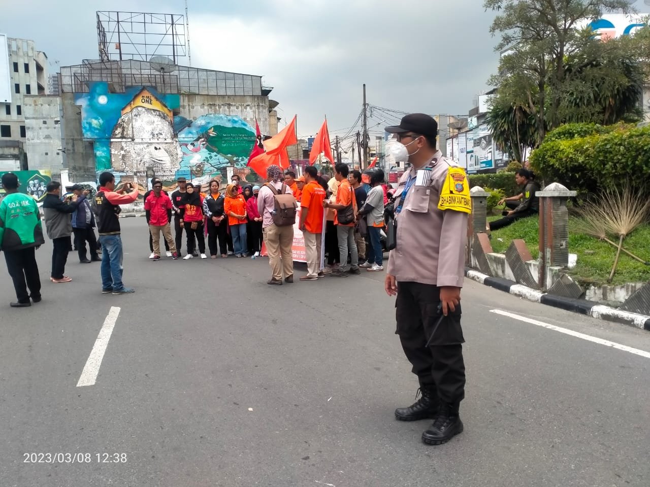 Medan, kedannews.com – Personel Polrestabes Medan kawal aksi unjuk rasa unjuk rasa yang dilakukan oleh Executive Committee Partai Buruh Provinsi Sumut di Jalan Gatot Subroto tepatnya depan tugu, Rabu (8/3/2023).