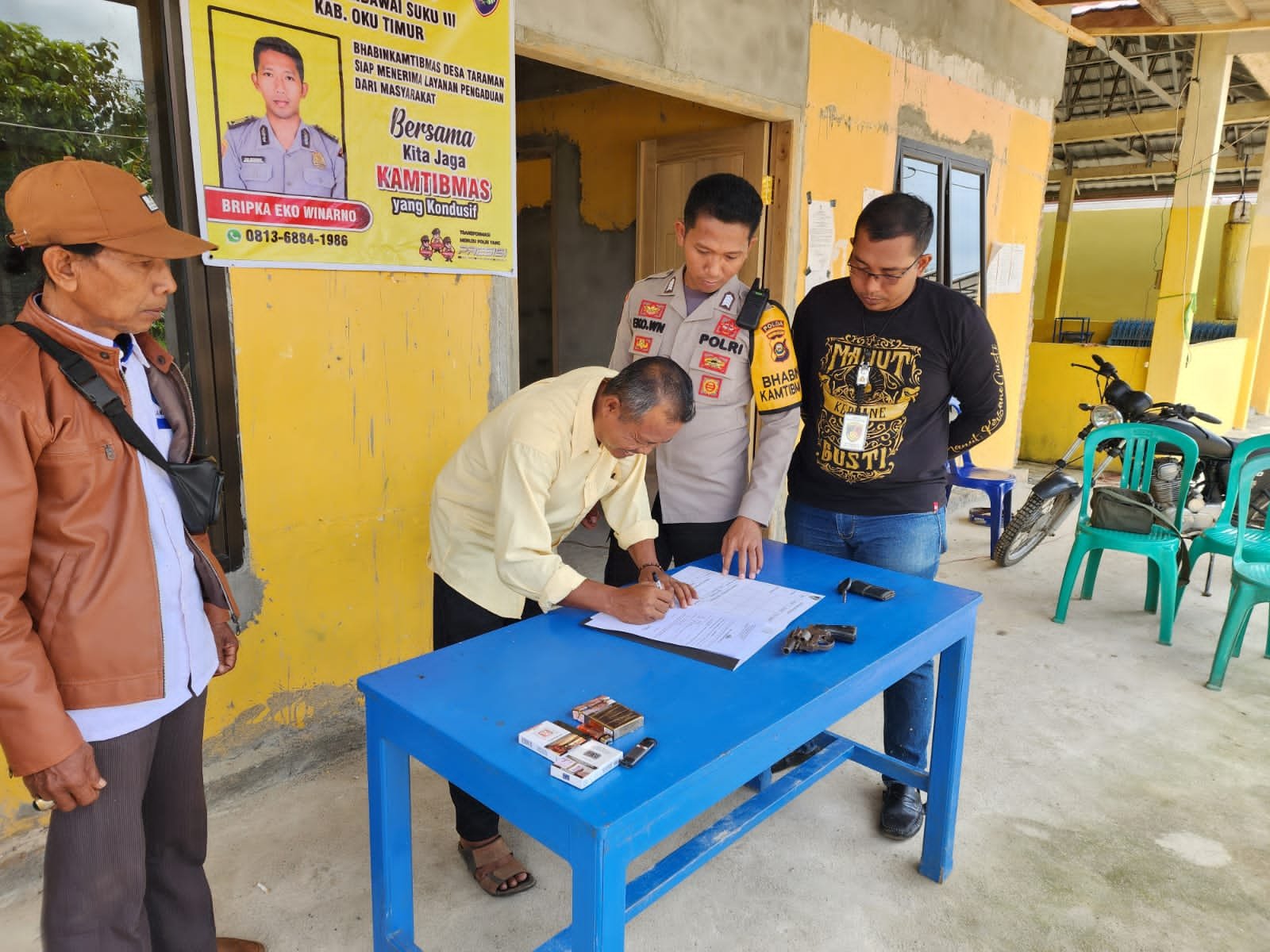 Suhendro (46) seorang Kepala desa Taraman yang beralamat di Desa Taraman Kecamatan Semendawai Suku III Kabupaten OKU Timur, secara sukarela menyerahkan senpi rakitan milik warga ke Polsek Semendawai Suku III.