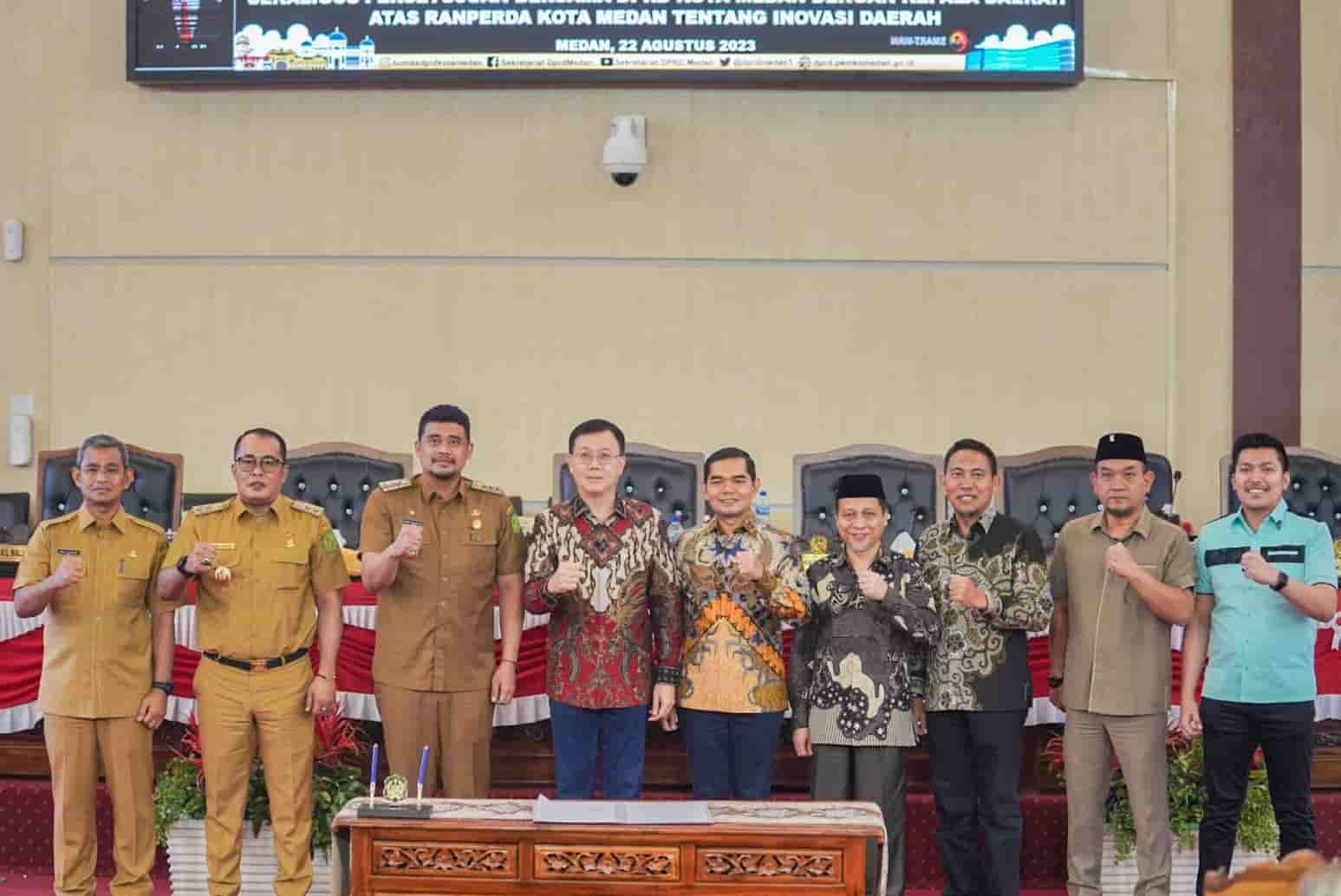 Medan, kedannews.com – Seluruh fraksi-fraksi di DPRD Medan menerima dan menyetujui Rancangan Peraturan Daerah (Ranperda) Kota Medan tentang Inovasi Daerah ditetapkan menjadi Peraturan Daerah (Perda). Hal ini ditandai dengan penandatangan persetujuan oleh Wali Kota Medan Bobby Nasution dan Ketua DPRD Medan Hasyim SE beserta Wakil Ketua DPRD Medan di Gedung DPRD Medan, Senin (22/8).
