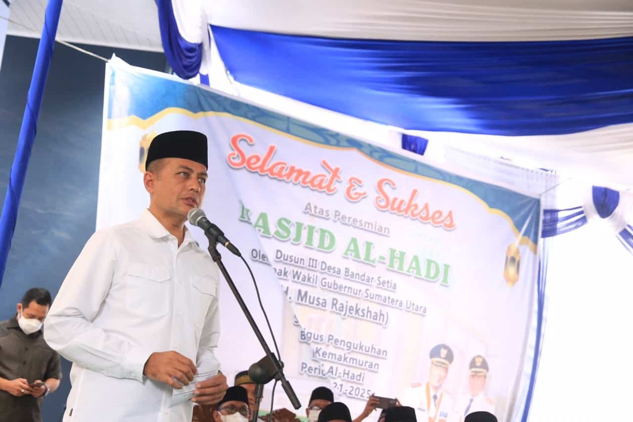 Deli Serdang, kedannews.com – Wakil Gubernur (Wagub) Sumatera Utara (Sumut) Musa Rajekshah menyampaikan apresiasi Β atas terbangunnya Masjid Al Hadi di Dusun III, Desa Bandar Setia, Kecamatan Percut Seituan, Kabupaten Deliserdang. Masjid yang berdiri atas 2 lantai ini terbangun atas gotong royong atau infak dan sedekah masyarakat setempat.