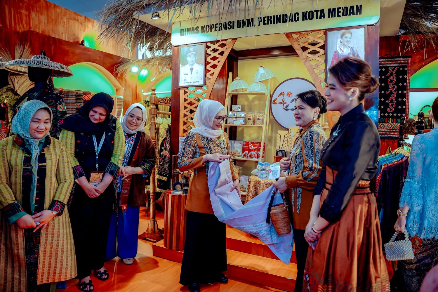 Stand Dekranasda Kota Medan tidak hanya menarik perhatian pengunjung, tapi juga Ibu Negara Iriana Joko Widodo sehingga mengunjungi stand yang menampilkan hasil kerajinan terbaik para perajin dari Kota Medan.