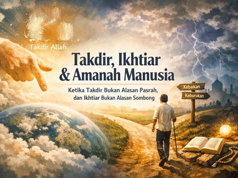 Dalam kehidupan beragama, takdir sering kali dipahami secara ekstrem. Di satu sisi, ada yang memaknainya sebagai ketentuan mutlak yang meniadakan peran manusia. Di sisi lain, ada pula yang menempatkan usaha manusia seolah-olah berdiri bebas tanpa campur tangan Tuhan. Padahal, Al-Qur’an menghadirkan pandangan yang utuh dan seimbang: segala sesuatu memang berada dalam ketetapan Allah, namun manusia tetap memikul amanah, diberi ikhtiar, dan dimintai pertanggungjawaban.