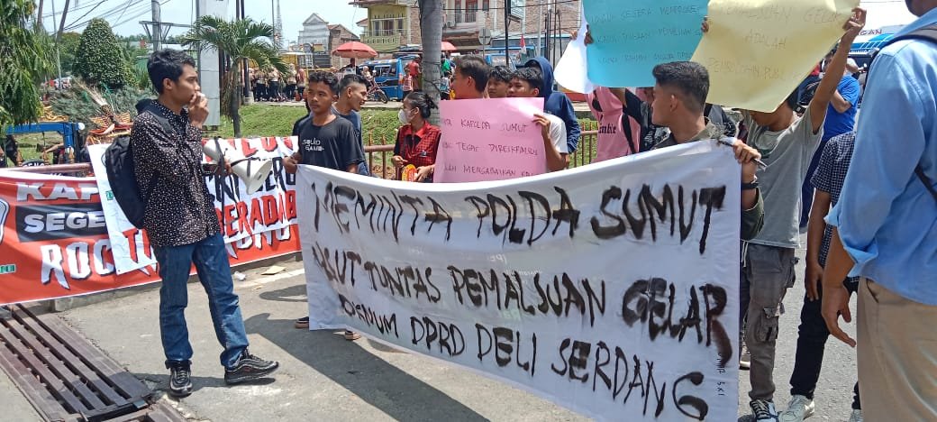“Kami meminta kepolisian agar segera mengusut tuntas dugaan penggunaan gelar palsu oleh anggota DPRD Deli Serdang, Drs RHMN. Sudah sejak 2022 lalu dilaporkan warga, tapi belum ada tindak lanjut hingga saat ini,” seru koordinator aksi, M Amin Siregar dalam orasinya.