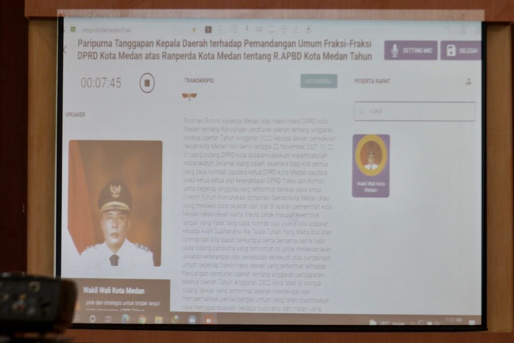 Medan, kedannews.com – Wali Kota Medan Bobby Nasution diwakili Wakil Wali Kota H. Aulia Rachman, menyampaikan Tanggapan Wali Kota Medan atas Pemandangan Umum DPRD Medan tentang Rancangan Anggaran Pendapatan Belanja Daerah (RAPBD) Tahun Anggaran TA 2022 dalam Rapat Paripurna DPRD, Senin (22/11) di gedung dewan. Rapat dipimpin Ketua DPRD Medan Hasyim, didampingi Wakil Ketua DPRD Medan H. Ihwan Ritonga, T. Bahrumsyah, Rajudin Sagala, dan diikuti segenap anggota dewan.