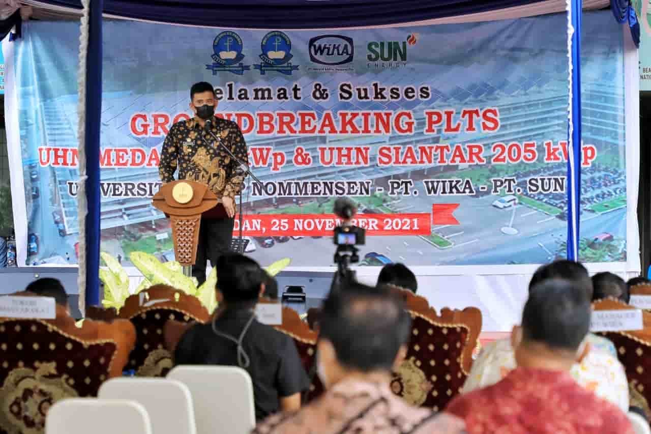 “Saat ini pengaplikasian penggunaan teknologi sudah diwujudkan oleh UHN melalui solar panel yang dapat menghidupkan aktifitas di kampus. Selain dapat bermanfaat bagi masyarakat Kota Medan, PLTS ini juga menjadi acuan atau tolak ukur bagi pengembangan energi baru terbarukan di Kota Medan,” Kata Bobby Nasution