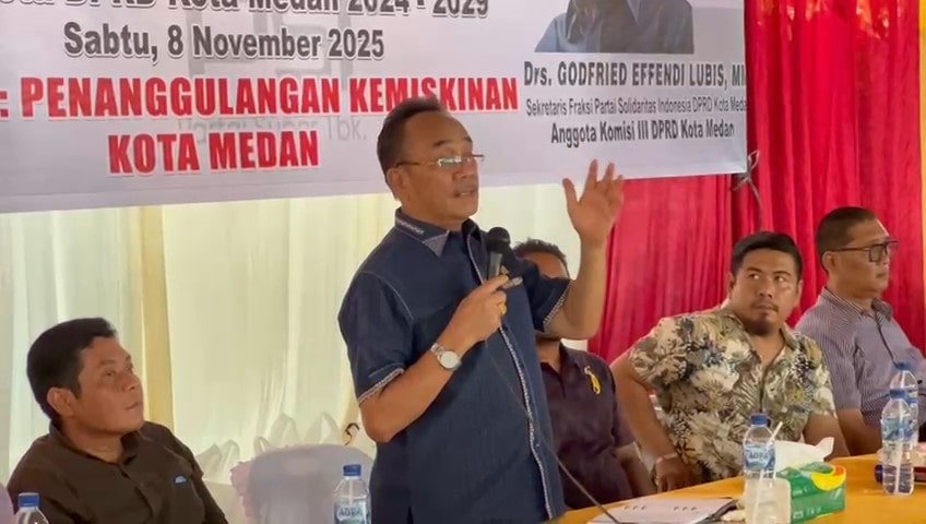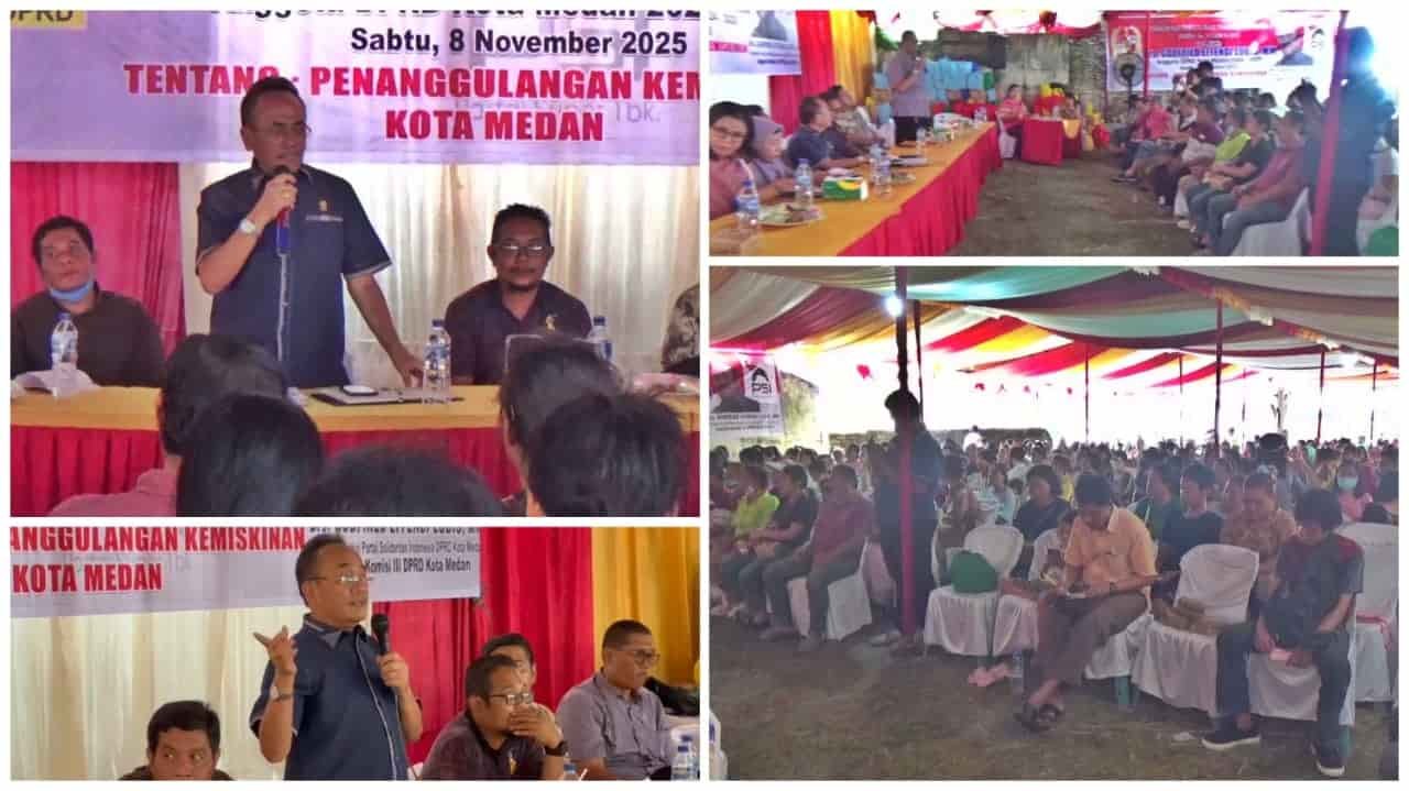 Medan, kedannews.co.id — Warga memadati halaman Jalan M. Nawi Harahap / Jalan Seksama, Komplek Pemda Blok K, Lingkungan 3, Kelurahan Binjai, Kecamatan Medan Denai, Kota Medan, Sabtu (8/11/2025). Mereka antusias mengikuti Sosialisasi Peraturan Daerah (Sosperda) Nomor 5 Tahun 2015 tentang Penanggulangan Kemiskinan yang digelar oleh Anggota DPRD Medan Fraksi PSI, Drs. Godfried Effendi Lubis, M.M.