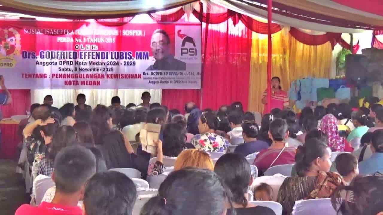 Medan, kedannews.co.id — Warga memadati halaman Jalan M. Nawi Harahap / Jalan Seksama, Komplek Pemda Blok K, Lingkungan 3, Kelurahan Binjai, Kecamatan Medan Denai, Kota Medan, Sabtu (8/11/2025). Mereka antusias mengikuti Sosialisasi Peraturan Daerah (Sosperda) Nomor 5 Tahun 2015 tentang Penanggulangan Kemiskinan yang digelar oleh Anggota DPRD Medan Fraksi PSI, Drs. Godfried Effendi Lubis, M.M.